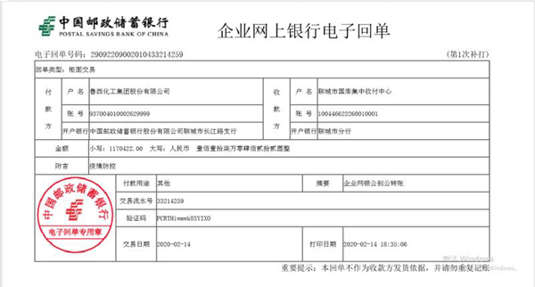 疫情就是命令,防控就是責(zé)任。捐款倡議發(fā)布后大家積極參與,踴躍捐款,許多干部員工主動多捐,奉獻(xiàn)愛心,以實際行動支持疫情阻擊戰(zhàn),短短一天時間,集團(tuán)干部職工共計捐款117萬元,并于2月14日18:30分匯入市國資委指定銀行賬號,支援一線的疫情防控工作。匯聚的顆顆愛心將涌動著奉獻(xiàn)的暖流,溫暖著人們齊心協(xié)力、共克時艱。
