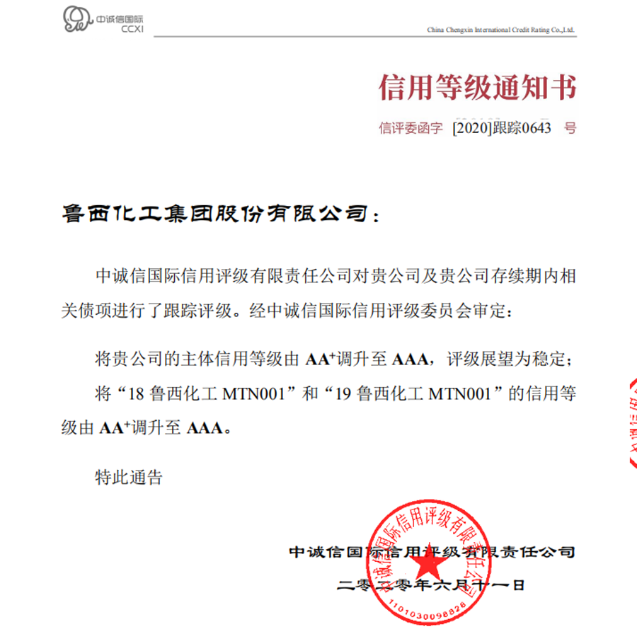 6月11日,中誠信國際信用評級有限公司出具最新評級報告,將魯西化工集團股份有限公司的主體信用等級由 AA + 調升至 AAA,評級展望為穩定。