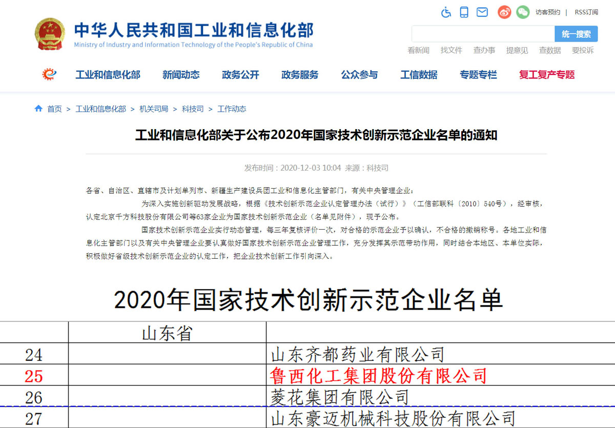12月3日,工業(yè)和信息化部公布了2020年國家技術(shù)創(chuàng)新示范企業(yè)名單, 魯西化工集團股份有限公司名列榜單。