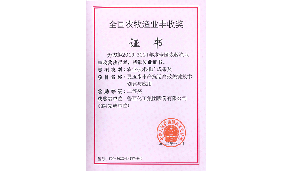 魯西化工集團(tuán)股份有限公司聯(lián)合山東農(nóng)業(yè)大學(xué)深耕夏玉米豐產(chǎn)抗逆高效關(guān)鍵技術(shù)創(chuàng)建與應(yīng)用,2022年9月,利用公司尿素硝銨溶液和液體肥研究的夏玉米豐產(chǎn)抗逆技術(shù),被農(nóng)業(yè)農(nóng)村部授予農(nóng)業(yè)技術(shù)推廣成果獎(jiǎng)二等獎(jiǎng),為保障國(guó)家糧食安全做出了重要貢獻(xiàn)。近日,該技術(shù)又喜獲“全國(guó)農(nóng)牧漁業(yè)豐收獎(jiǎng)”。