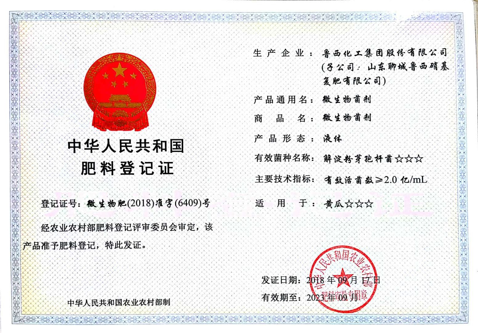 10月7日,收到了農業農村部肥料評審登記管理處寄來的魯西集團農業用微生物菌劑肥料登記證書,共涉及兩個菌種:解淀粉芽孢桿菌、多粘類芽孢桿菌。登記證號分別為“微生物肥(2018)準字(6409)號”、“微生物肥(2018)準字(6410)號”。登記證有效期至2023年9月。
