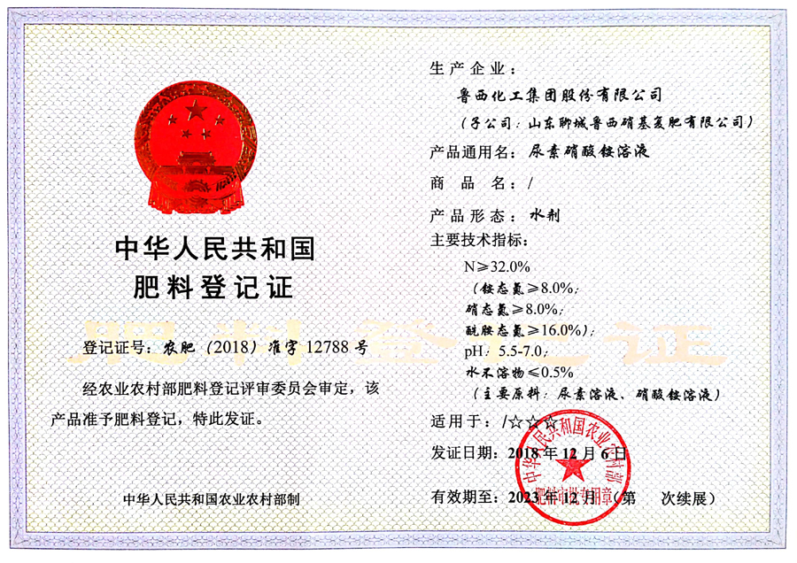 12月21日,收到了農(nóng)業(yè)農(nóng)村部肥料評審登記管理處寄來的魯西集團(tuán)尿素硝酸銨溶液(32%)肥料登記證,登記證號為“農(nóng)肥(2018)準(zhǔn)字12788號”,登記證有效期5年。